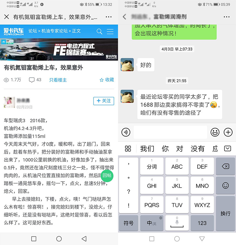 有機(jī)氮鉬富勒烯和非硫磷有機(jī)鉬,自從投入市場(chǎng)以來(lái),受到普遍認(rèn)可和廣泛應(yīng)用,目前國(guó)內(nèi)有大約100家左右的潤(rùn)滑油企業(yè)、品牌作為高端、高性能潤(rùn)滑油的核心配方,大量使用,并出口美國(guó)、歐盟、東南亞等多個(gè)國(guó)家。在汽車(chē)后市場(chǎng)領(lǐng)域,公司旗下兩大自主品牌引擎威哥、華億金衛(wèi)以每瓶198元全國(guó)統(tǒng)一價(jià),已經(jīng)在全國(guó)上百萬(wàn)輛發(fā)動(dòng)機(jī)中使用,得到良好贊譽(yù),比如國(guó)內(nèi)高端玩車(chē)俱樂(lè)部愛(ài)卡聯(lián)盟,有機(jī)氮鉬富勒烯完全刷爆愛(ài)卡論壇。在蘇汽的節(jié)油經(jīng)過(guò)3個(gè)月的節(jié)油實(shí)驗(yàn),實(shí)車(chē)節(jié)油率達(dá)到5%以上;在青島港減排實(shí)驗(yàn)中,實(shí)車(chē)數(shù)據(jù)減排達(dá)到35%以上。