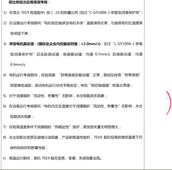 應(yīng)用在撫順煤礦電機(jī)制造有限公司,電機(jī)軸承加注昆侖7019潤(rùn)滑脂,出廠測(cè)試運(yùn)行過(guò)熱、噪音大----待修品,加入我們的核心劑軸承運(yùn)行平穩(wěn)、溫度正常、無(wú)異響----合格品。